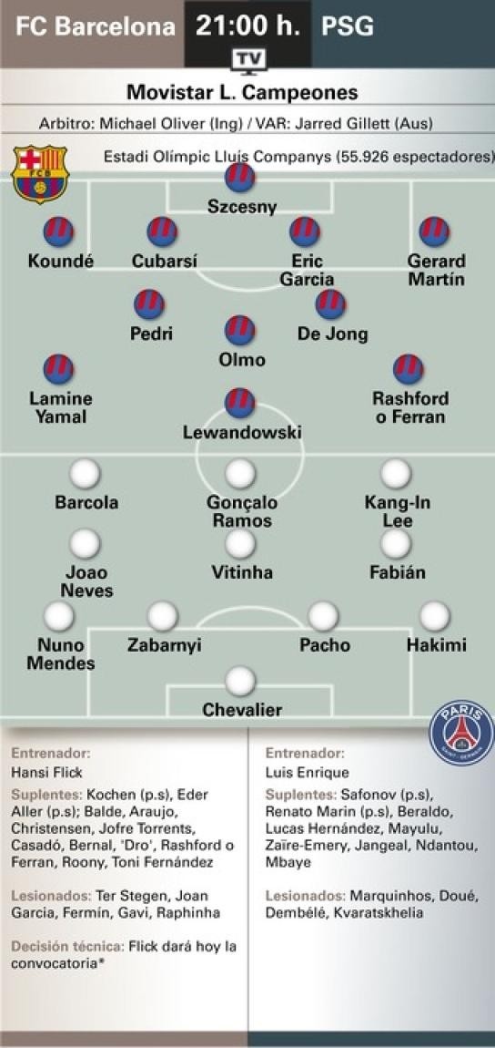 今晚的挑战可能更为艰巨,因为伤病潮正侵袭着巴黎。尽管他们是法甲领头羊,但此前已败给马赛。恩里克几周前就知道登贝莱和杜埃无法冲击巴萨防线,并一直在打磨B计划,但克瓦拉茨赫利亚在最后时刻也加入了伤病名单。在今年欧冠决赛中摧毁国际米兰的首发攻击线将无法在巴塞罗那出战,马尔基尼奥斯也无法坐镇后防,而中场方面维蒂尼亚、法比安和若奥-内维斯也只是刚刚够用。巴尔科拉、贡萨洛-拉莫斯和李刚仁可能组成锋线,但这并不意味着能低估巴黎,他们此前已经以4-0大胜亚特兰大开启了卫冕征程。